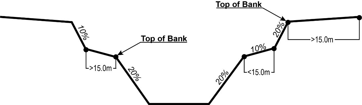 means the natural transition line at the top of a valley, or at the top of a channel that contains a watercourse, between a slope where the grade exceeds 15 percent and the adjacent upper level area where the grade is less than 15 percent, and where area that is less than 15 percent in slope is at least 15.0m wide. Where banks are not well defined (e.g. in the case of lakes, wetlands or ponds), the top of the bank is equivalent to the high-water mark or floodplain, whichever is greater. |